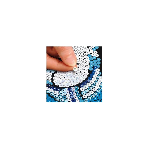 A partir de 5 años. Contiene: Placa de poliestireno, fondo de papel impreso con el dibujo, lentejuelas de los colores necesarios, alfileres e instrucciones detalladas. Tamaño 17 x 17 cm.