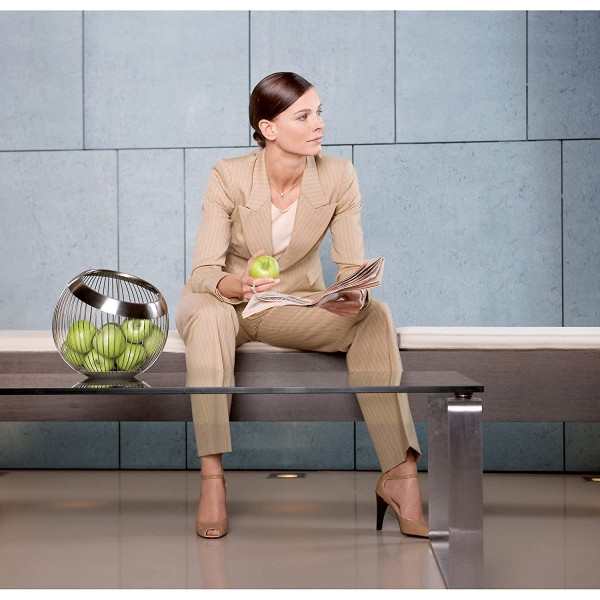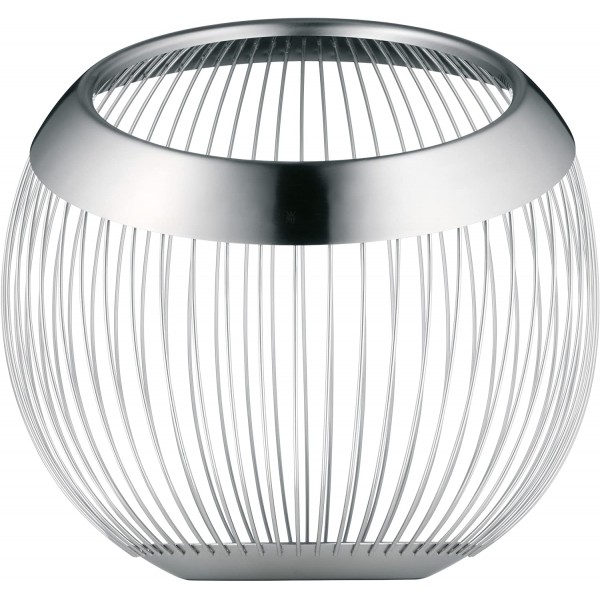 Esta cesta de alambre tiene un diámetro de 19 cm y una altura de 26 cm. Puede guardar fruta en la encimera de la cocina o servir panecillos y croissants recién perfumados en la mesa. La cesta está fabricada con Cromargan® mate de eficacia probada: acero inoxidable 18/10. Esto se aplica tanto a los alambres estrechos como al anillo de metal que se extiende por la abertura inclinada hacia adelante y la base. El material de alta calidad garantiza durabilidad y fácil cuidado. Gracias a la cuidadosa mano de obra, la canasta conserva su forma a largo plazo, a pesar de los alambres de filigrana.