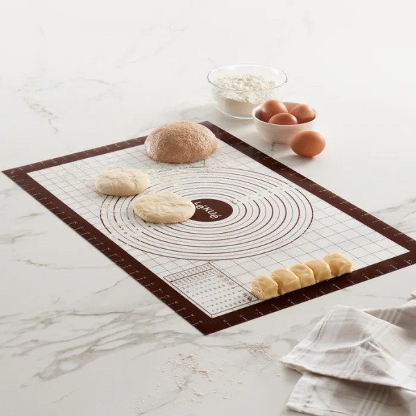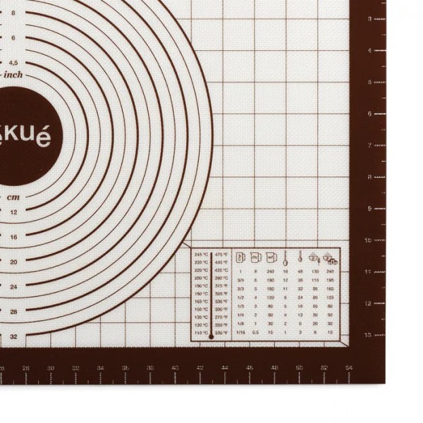 Tapete de silicona platino con fibra de vidrio, antiadherente, perfecto para trabajar cualquier tipo de masa. Con indicaciones de diámetros, regla en el contorno, guías para tiras y tabla de conversiones; es le perfecto aliado para trabajar tus masas al milímetro