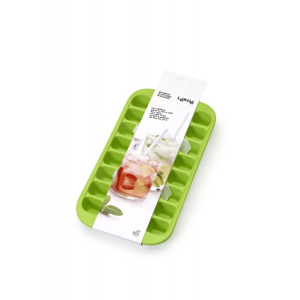 Tapa que evita que los cubitos cojan malos olores. Fácil extracción de los cubitos, de uno en uno, tan solo torneando la bandeja. Forma plana de la bandeja que permite apilar otras cosas encima. Apto lavavajillas. Medida: 35x14x4,50 cm
