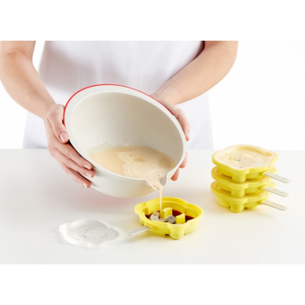 Incluye molde de silicona efecto 3D y 50 palitos desechables. 4 helados Apto para horno y lavavajillas. Hecho en Italia.