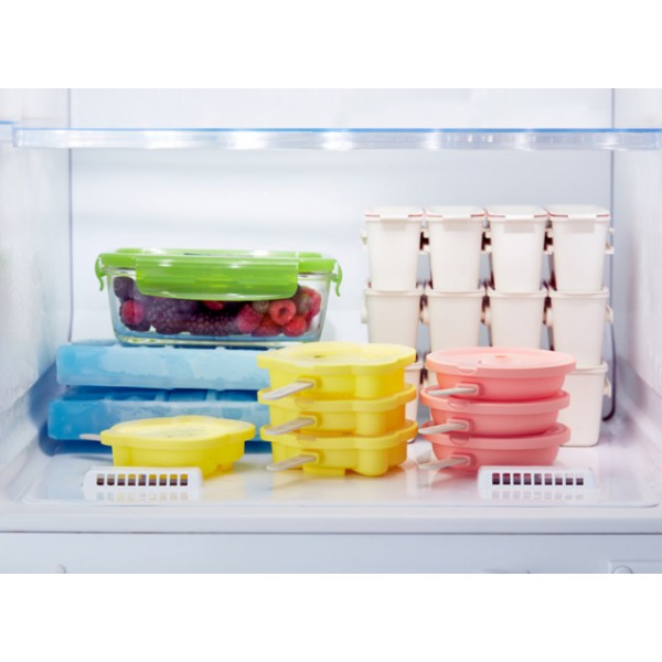 El molde contiene una tapa para proteger el helado de los olores. Los moldes son apilables entre ellos para ahorrar espacio en el congelador o al almacenarlos.