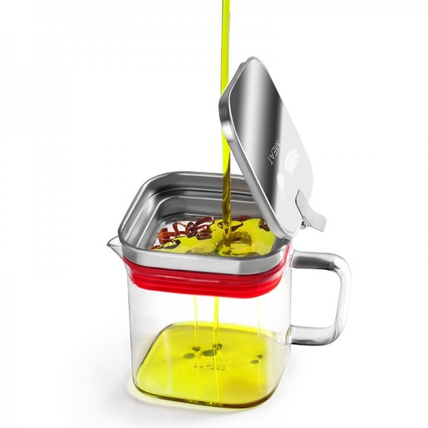 Grasera con tapa en acero inoxidable, con filtro para reciclar el aceite y jarra de borosilicato.