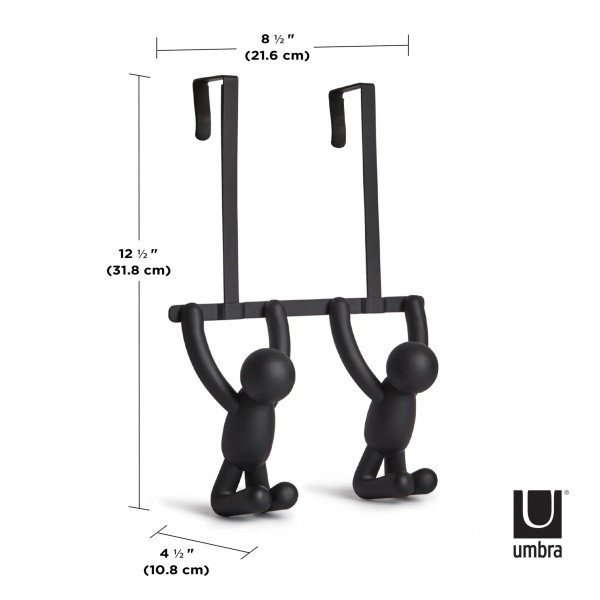 Gancho Doble Umbra Buddy para Puerta. El gancho doble Buddy para puerta presenta la figura característica de Buddy de Umbra, esta vez como un gancho para puerta, ideal para guardar pertenencias como sombreros, bufandas, abrigos y carteras. Esta pieza decorativa tiene un aspecto más activo que tu gancho típico, ya que Buddy parece estar en movimiento. Moldeado con un acabado mate y disponible en negro o blanco a elección, Buddy OTD está hecho para puertas de hasta 1 ½ pulgadas (4 cm) de grosor y mide 8.5 x 12 x 4.25" (21.6 x 30.5 x 10.8 cm). Mantenga los artículos a los que necesita acceder regularmente fácilmente a mano con este gancho lúdico y decorativo.