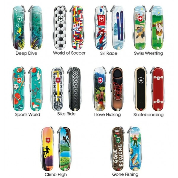 Permítanos presentarle una gama verdaderamente original; estas navajas multiusos son superiores y creativas; ganadoras por naturaleza. Ustedes, nuestros seguidores de Victorinox de todo el mundo, conceptualizaron, crearon y eligieron diez diseños deportivos. Nacidos para rendir homenaje a algunos de los deportes más amados del mundo, los coloridos y llamativos gráficos celebran el diverso mundo de los deportes. La edición limitada de Classic 2020 , que brinda siete funciones de estilo de vida, es un verdadero artículo de colección que lo va a acompañar a donde vaya.