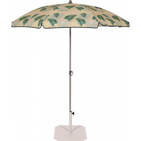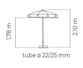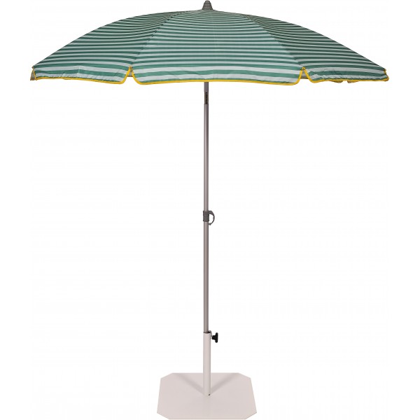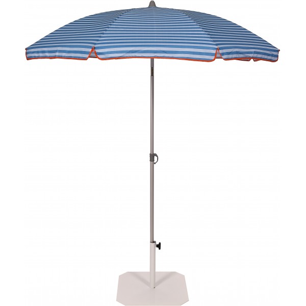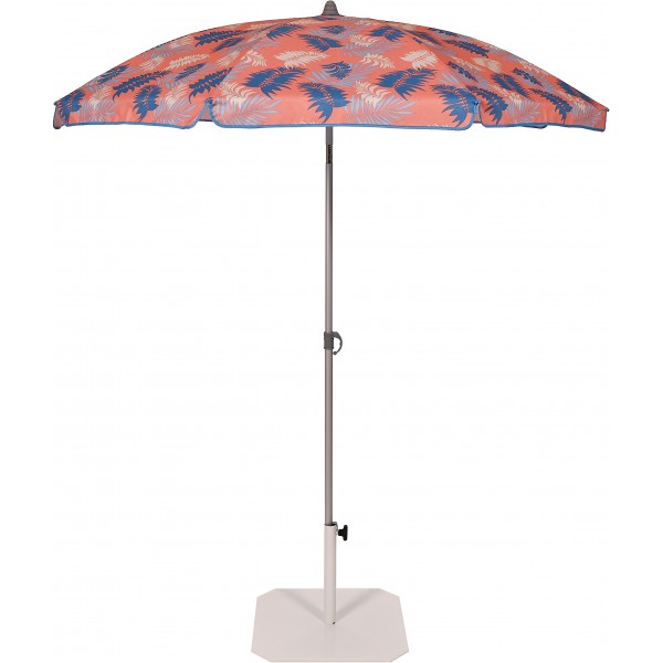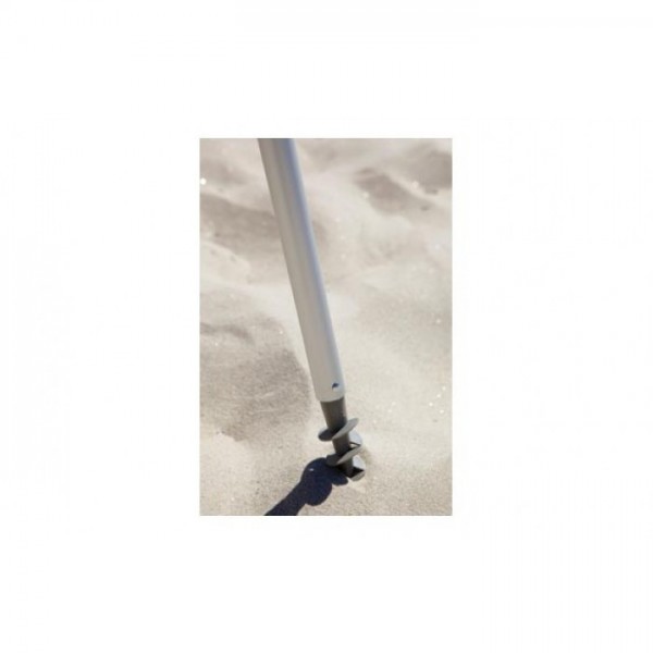 Parasol muy ligero de aluminio de 2 secciones. 8 varillas de fibra de vidrio de (5mm). Confecionado con tejido 100% poliéster con protección solar UPF50+. Rosca para enterrar en la arena. Funda de tejido con asa. Base no incluida. Muy fácil de lavar y desinfectar. Producto de uso público y doméstico.