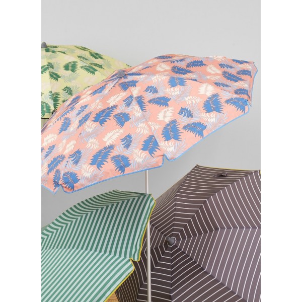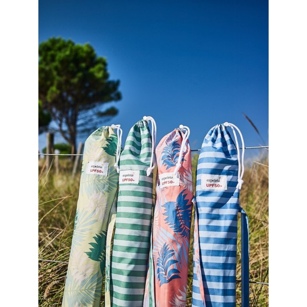 Sombrilla regulable para playa con diseños veraniegos. Con tratamiento UPF50+, perfecta para disfrutar del verano y protegerse del sol. De aluminio de dos secciones y con 8 varillas de fibra de vidrio (5mm), para mayor durabilidad y comodidad. Disponible en cuatro estampados diferentes, será tu aliada perfecta para el verano