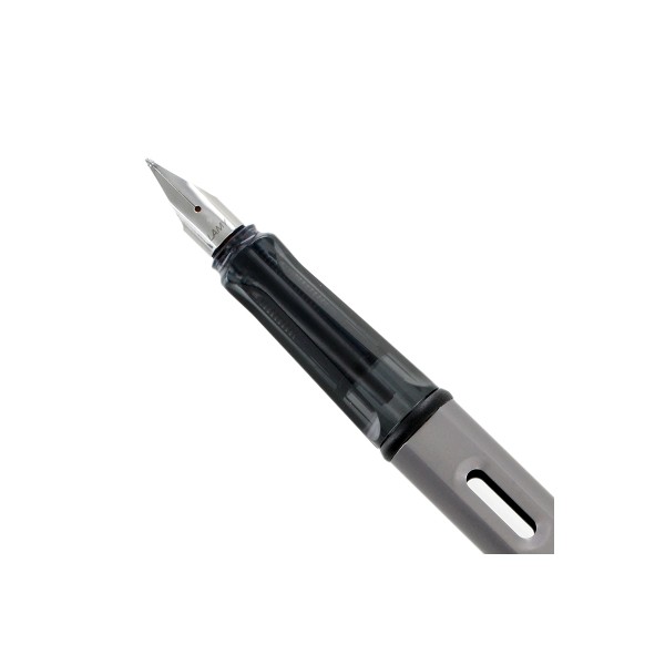 Estilográfica clásica con plumín de acero negro, empuñadura ergonómica.