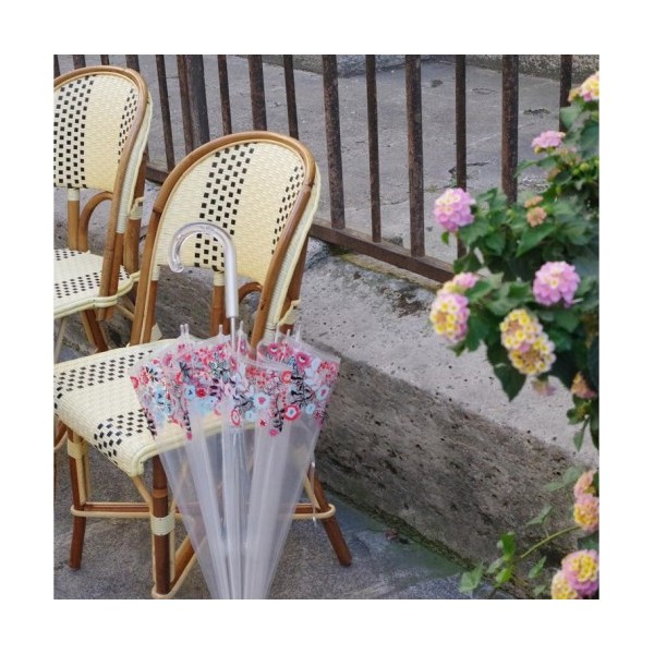 Paraguas transparente automático, motivos de Paris. 81 cm de longitud, 80 cm diámetro abierto Las varillas son de metal.