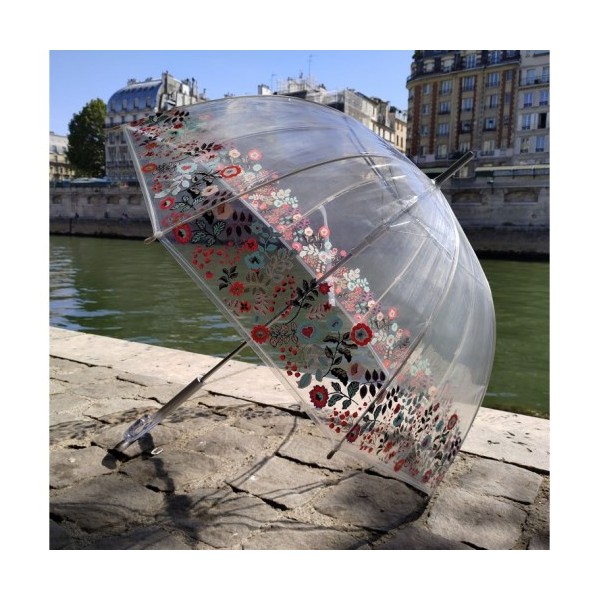 Paraguas transparente automático, motivos florales. 81 cm de longitud, 80 cm diámetro abierto Las varillas son de metal.
