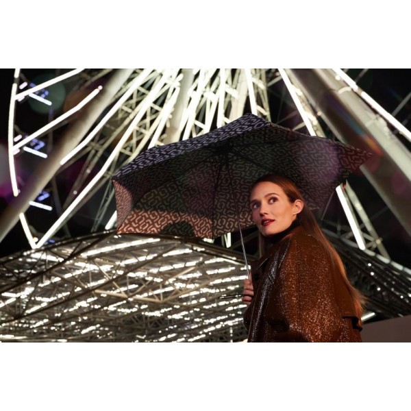 Paraguas plegable con apertura y cierre automáticos de la firma francesa Smati Con sólo 28 cm cabe en cualquier sitio De tela negra con notas musicales.