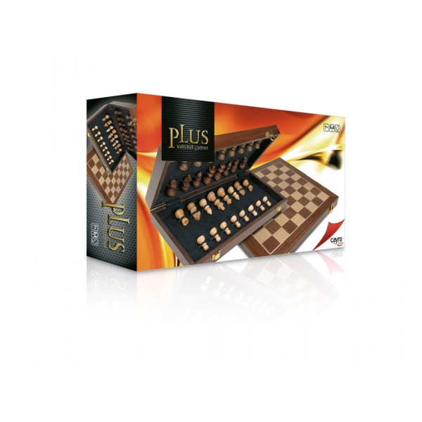 Estuche de madera plegable con tablero de ajedrez realizado en marquetería de 41×41 cm en la parte exterior barnizado brillo y en el interior forrada de fieltro con las fichas de madera sujetas sobre el fieltro para su transporte.