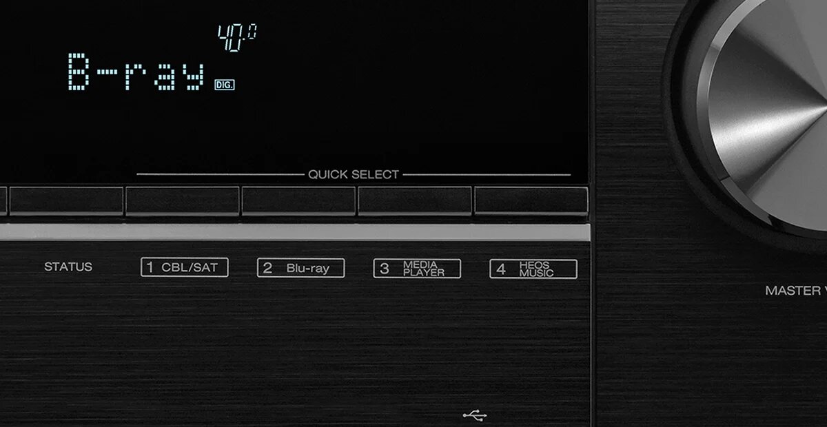 El panel frontal del AVR-X2700H de Denon incluye cuatro botones Quick Select en los que podrás guardar tus ajustes de audio preferidos para cada fuente. Cuando conmutes entre tu televisor, reproductor Blu-ray, reproductor multimedia, etc., el AVR-X2700H ajustará la ecualización según tus preferencias para la fuente seleccionada. Puedes usar los botones del panel frontal o los botones Quick Select del mando a distancia del receptor AV para un control más rápido.