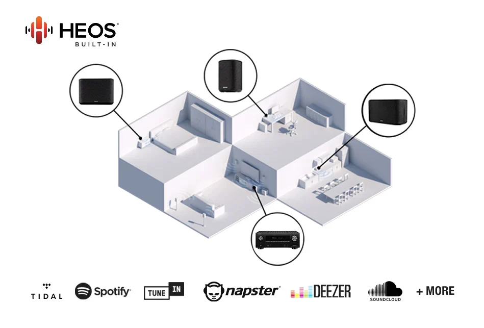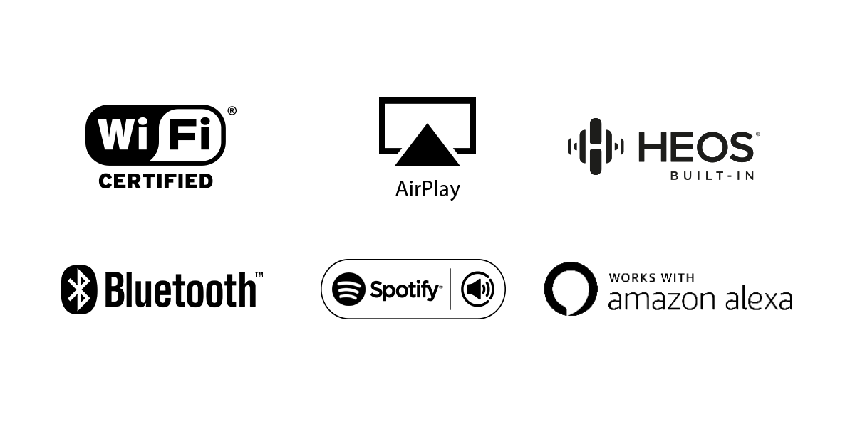 Transmite tu música favorita desde cualquier lugar y en cualquier lugar de tu casa con la tecnología HEOS integrada. Disfruta de la música de alta calidad de una gran variedad de servicios de streaming como Spotify®, TuneIn, Amazon Music HD, iHeartRadio, Soundcloud®, Tidal, Napster, Deezer o fuentes de música locales. Y contrólalo todo a la perfección con la aplicación gratuita HEOS.