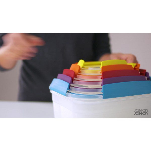 Set compuesto por 5 herméticos a prueba de fugas que se apilan perfectamente unos dentro de otros para ocupar menos espacio en la cocina. Están fabricados en resistente plástico y cuentan con tapas y bases codificadas por colores.