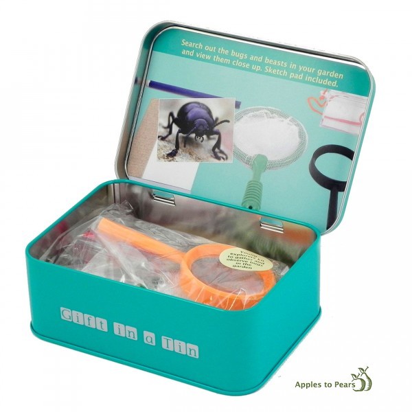 Contenido: red caza mariposas mini, lupa, caja para insectos, bloc de notas y lápiz, todo en una preciosa caja metálica, con tapa