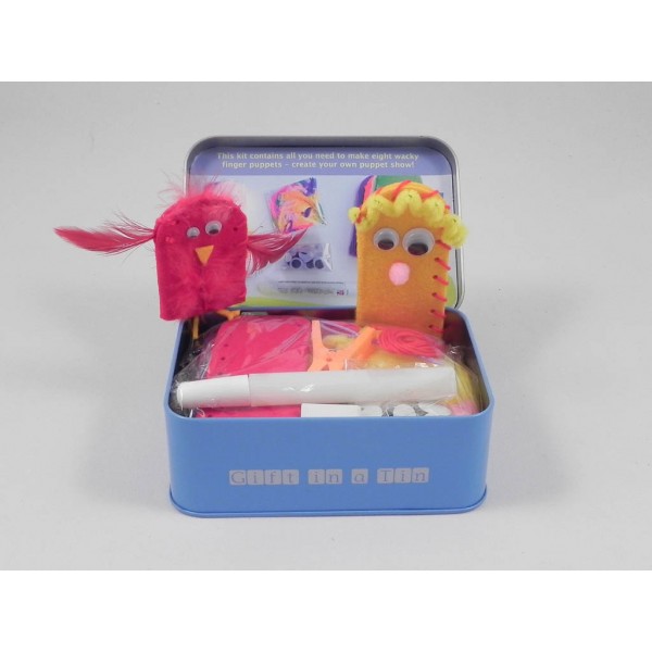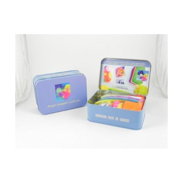Contenido: Cuerpo 8 marionetas, aguja plástica, hilo, material de decoración, cola e instrucciones todo en una preciosa caja metálica.