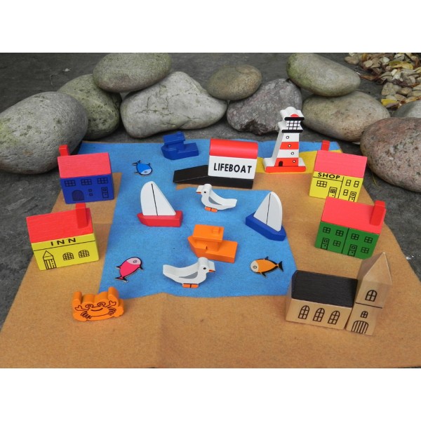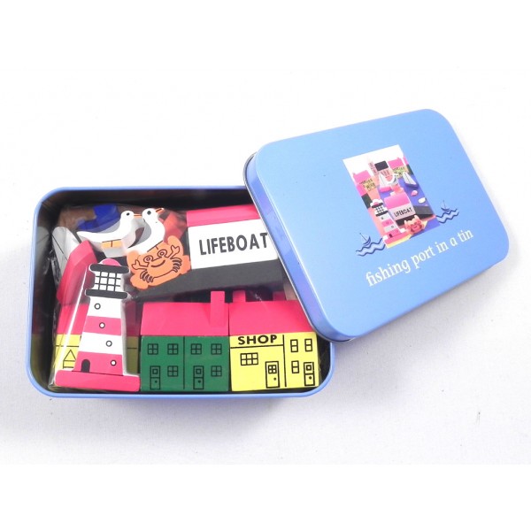 Contenido: Piezas de madera para hacer tu puerto, peces de cartón, alfombrilla de fieltro recreando un puerto e instrucciones, todo en una preciosa lata para guardarlo en poco espacio.