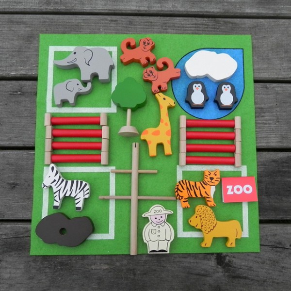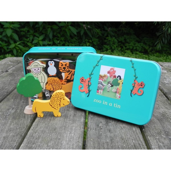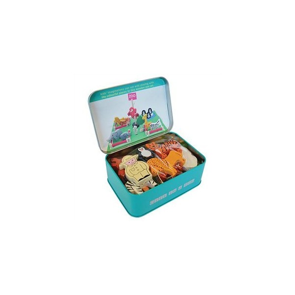 Contenido: Piezas de madera para hacer tu zoo, animales, verjas, cuidador, letreros, alfombrilla de fieltro recreando un prado e instrucciones, todo en una preciosa lata para guardarlo en poco espacio.
