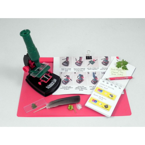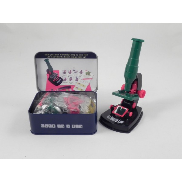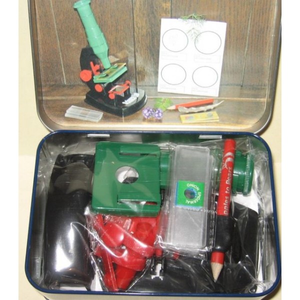 Contiene piezas del microscopio, muestras, lápiz y hojas de observaciones todo ello en una lata para recogerlo todo