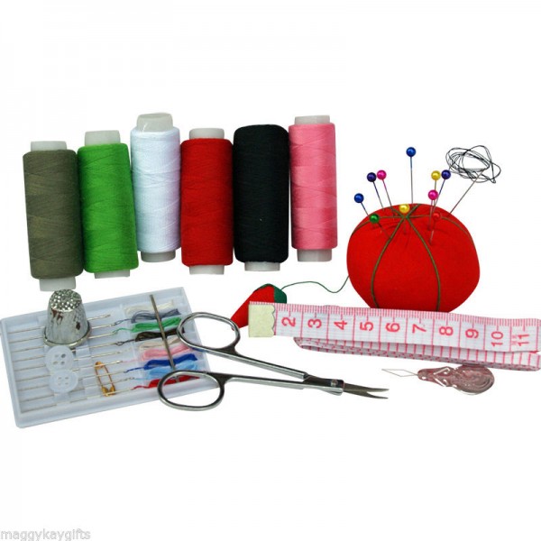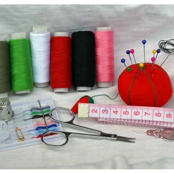 Contiene agujas, hilos, alfileres, dedal, tijeras, hasta un alfiletero y un enhebrador de agujas todo ello en una lata para recogerlo todo