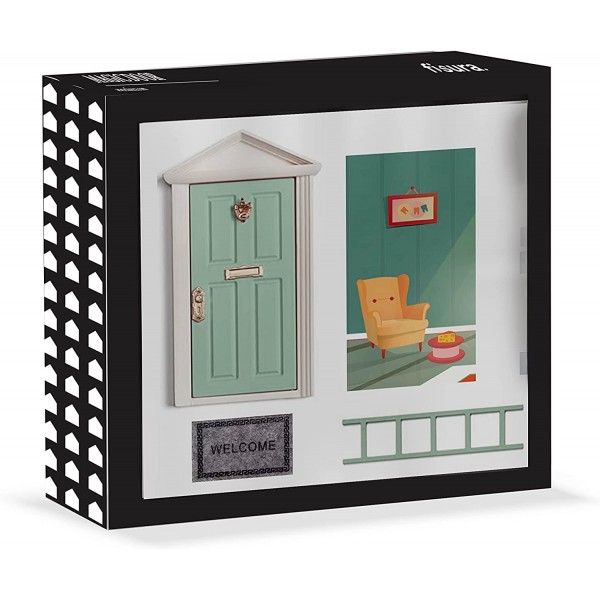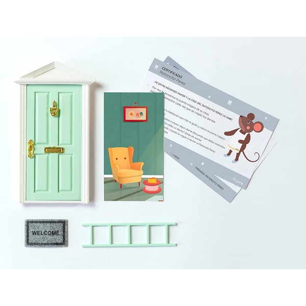Incluye puerta de 17,5 x 10,5 cm, felpudo de 5.5 x 3 cm, pegatina para crear ambiente en la puerta al abrirla de 7 x 14,5 cm, tarjeta de certificado del ratoncito Pérez de 18 x 10 cm