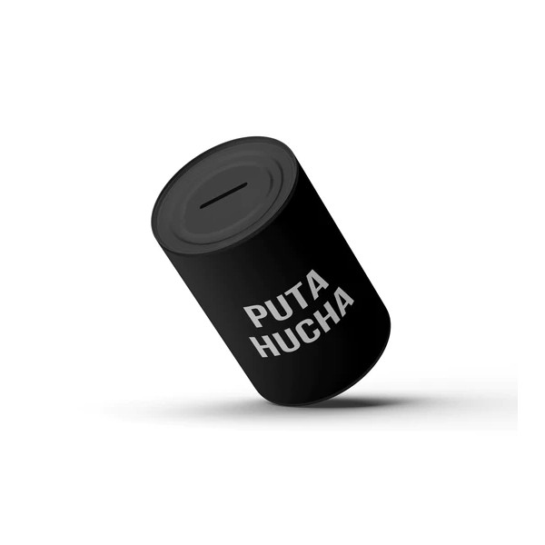 Hucha de color negro con las letras 'Puta hucha' en blanco.