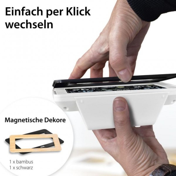 Reloj radio controlado con indicación de temperatura interior Visualización de la hora (12/24) Ajuste manual o automático de la hora a través de la señal DCF Cambio de hora automático invierno/verano Calendario perpetuo en 7 idiomas Dos despertadores con función repetición Pantalla iluminada con pulsación Plástico ABs y bambú natural Medidas: 7,2 x 7,2 x...