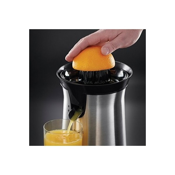 Exprimidor para cítricos con dos conos. Boca de salida con sistema antigoteo. Acabado elegante en cromargan