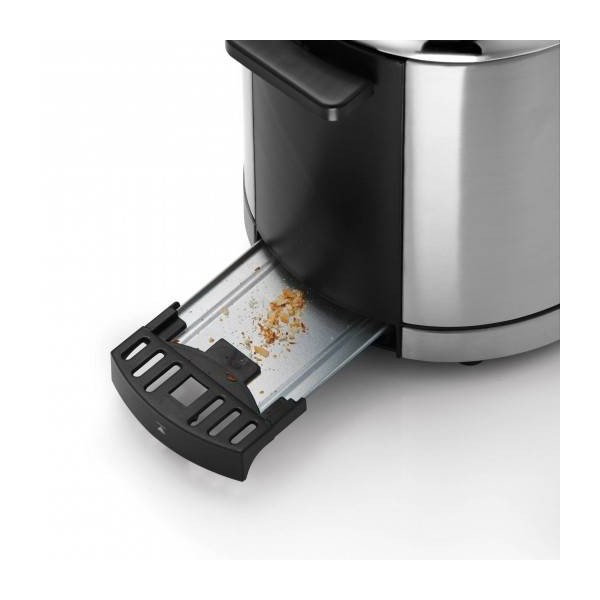 Tostadora de ranura larga, para mayor capacidad. Suplemento para panecillos, o bollería. Teclas de función iluminadas ( parada, tostar, volver a tostar, descongelar y bagel) Incluye pinza para el pan. Acabado elegante en cromargan