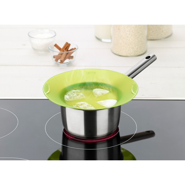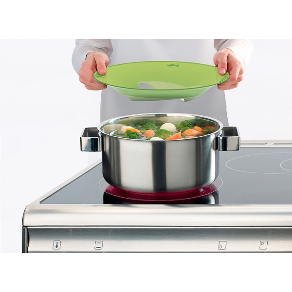 Evita derrames derivados de la cocción, siendo ideal para arroces, pastas y caldos. Permite la salida del vapor tracias a su aperturas que retienen el líquido en circulación ayudando a mantener la cocina limpia y sin salpicaduras.