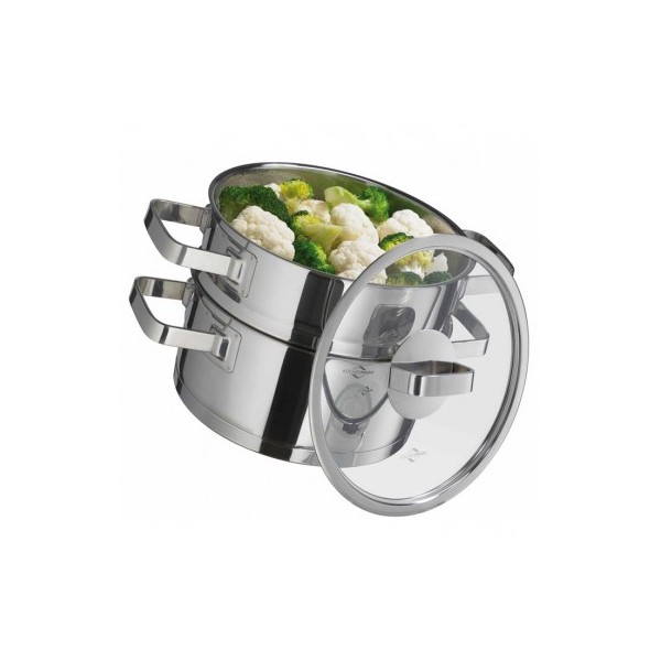 Olla de acero inoxidable con inserto para cocción al vapor.