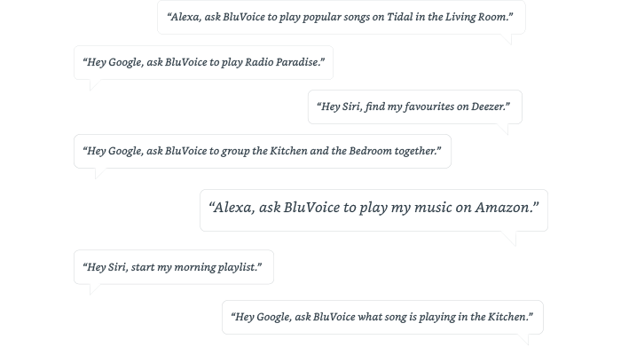 Gracias a su integración con Amazon Alexa, Google Assistant y Siri de Apple, los altavoces Bluesound se pueden controlar por voz utilizando comandos sencillos o personalizados. Selecciona canciones, reproduce tu playlist favorita, pausa o salta una canción, e incluso indica en qué sala de tu hogar quieres que suene qué música. Una forma fácil y cómoda de controlar el sonido de toda tu casa.