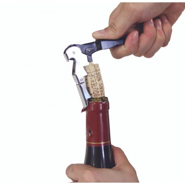 La apertura en cremallera de este sacacorchos es ingeniosa y original. Permite extraer el corcho sin esfuerzo. Indica el nivel de perforación en una escala lateral, ya que no se debe perforar más de 45 mm. para no atravesar el corcho.