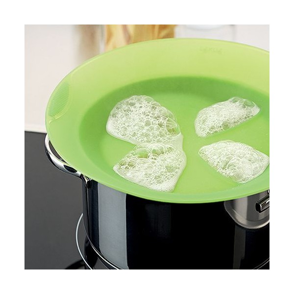 Salvamanteles de silicona plegable. Antideslizante y anti-arañazos. Resistente hasta 340º C. Adecuado para cacerolas de hasta 25 cm de diámetro.