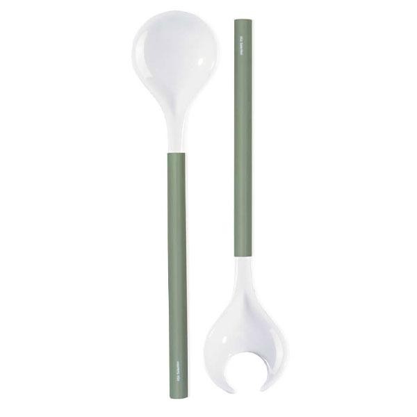 Cubiertos de ensalada de madera pintada y con pala de cerámica.