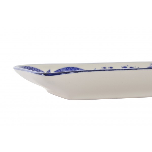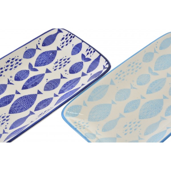 Set para aperitivos con bandejitas en forma de pez. Porcelana y madera de acacia.