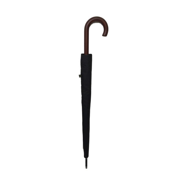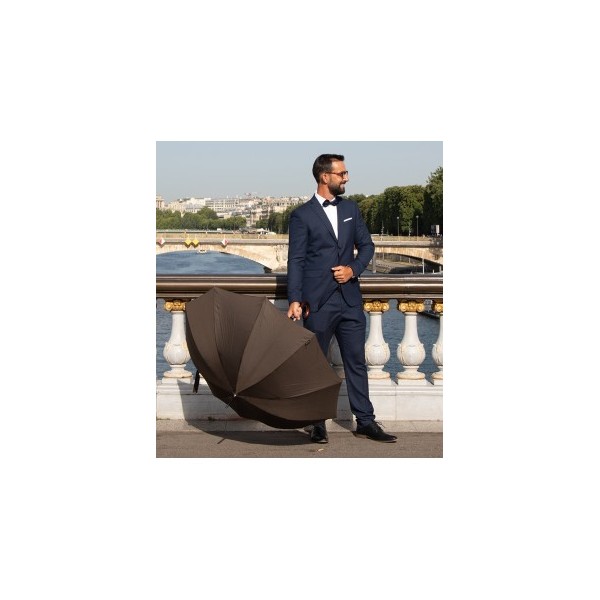 Retour aux sources de l'accessoire avec ce long parapluie canne noir muni de la traditionnelle poignée courbe en bois et du tape-à-terre. Pas surranné, il est anti-vent et nous l'avons équipé d'une ouverture automatique. Style assuré !